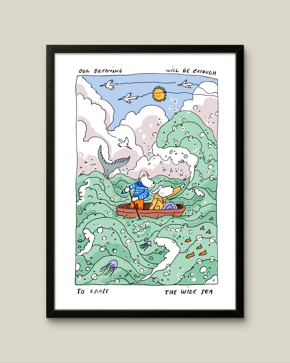 Premium digital illustration print, on FSC certified, 350gsm 100% recycled card stock. Comes wrapped in compostable packaging, or framed in recycled polcore frames. Please get in touch for enquires about larger sizes.